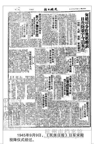 1945年9月9日,中国战区日军投降签字仪式在南京中国陆军总部礼堂正式举行。何应钦奉命以国民政府军事委员会参谋总长兼中国陆军总司令的名义,代表中国战区最高统帅部主持受降。冈村宁次等7人代表日本帝国政府及日本大本营签署投降书。何应钦检视冈村宁次呈递的证明文件后,将日军投降书的中文本两份交由冈村宁次签字。冈村宁次在两份降书上签字盖章后,由日军总参谋长小林浅三郎将降书呈递何应钦,何应钦检视后在日军投降书上签字盖章。仪式结束后,何应钦发表广播演讲,宣告日军在华投降签字仪式完成。