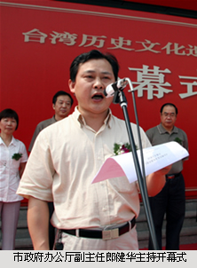 • 5月30日,由杭州市人民政府台湾事务办公室、杭州市档案局(馆)和杭州市台胞台属联谊会联合举办的《台湾历史文化遗存展》在杭州市档案馆拉开帷幕。市政协副主席、市台胞台属联谊会会长郁嘉玲,市政协副主席、市民进主委赵光育,浙江省档案局副局长王茂法,浙江省台办联络处处长顾钦祥,市人民政府台湾事务办公室主任陈建伟,市政府办公厅副主任郎健华,市人民政府台湾事务办公室副主任王小华,杭州市档案局副局长赵建国、冯少平等领导出席了展览开幕式。参加开幕式的还有各民主党派领导,各区台办和档案局(馆),各市直属单位代表和市台联会员代表等共300多人。市政府办公厅副主任郎健华主持了开幕式。
