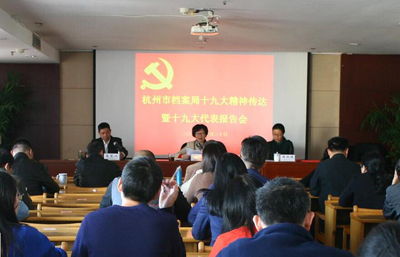 10月30日,杭州市档案局召开十九大精神传达暨十九大代表报告会,范飞局长传达十九大精神并讲话,对贯彻学习党的十九大精神进行了部署,会议邀请了杭州市党的十九大代表周明娟同志作报告。全局干部职工聆听了报告。