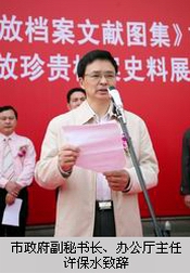 • 为纪念杭州解放60周年,再现先辈们不屈不挠、浴血奋战、英勇献身的革命精神,让更多人,尤其是年轻一代了解那段解放杭州、接管杭州的历史经过,4月29日上午,市档案馆隆重举行《杭州解放档案文献图集》首发式暨《杭州解放珍贵档案史料展》开幕式,首次以书籍和展览的形式,向社会公布部分杭州解放的珍贵档案史料。省档案局局长鞠建林,市政府副秘书长、办公厅主任许保水,市档案局局长郎健华、副局长赵建国、吕芬芳,市人大教科文卫副主任奚国强,市党史办副主任俞明辉等参加开幕式。仪式由郎健华局长主持。