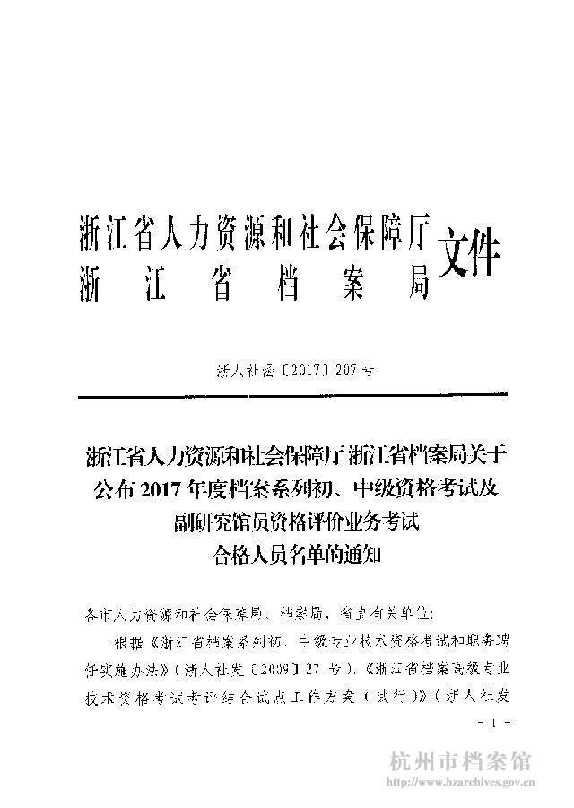 关于公布2017年度档案系列初、中级资格考试及副研究馆员资格评价业务考试合格人员名单的通知
